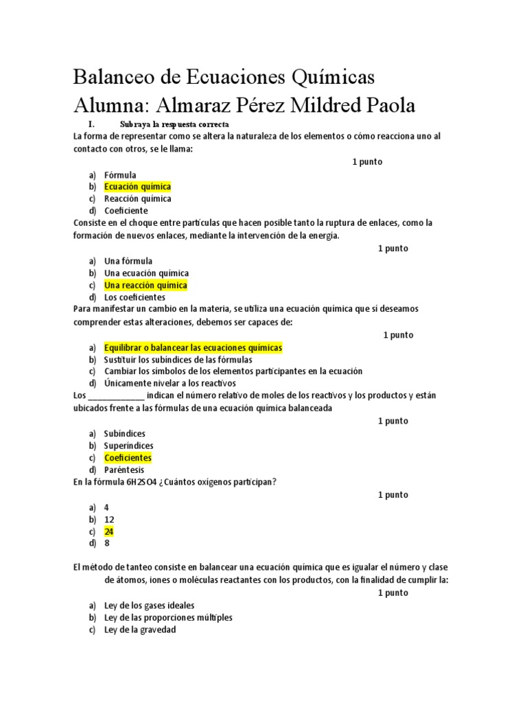 Cuestionario Balanceo De Ecuaciones Quimicas Pdf Estequiometria Quimica