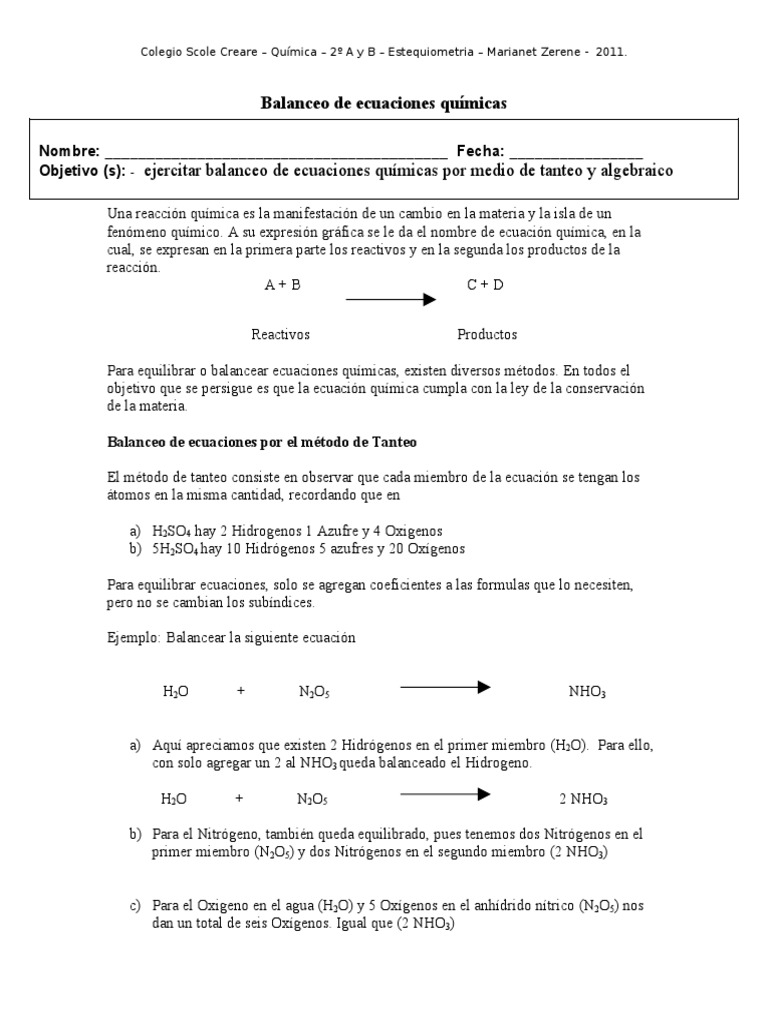 Balanceo De Ecuaciones Quimicas Por Tanteo Docsity
