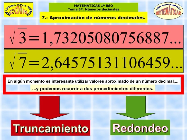 Redondeo o aproximación decimal. 8 es mayor que 5 - 7 1 8. Es el número con un determinado número de cifras que es inmediatamente menor que el dado.