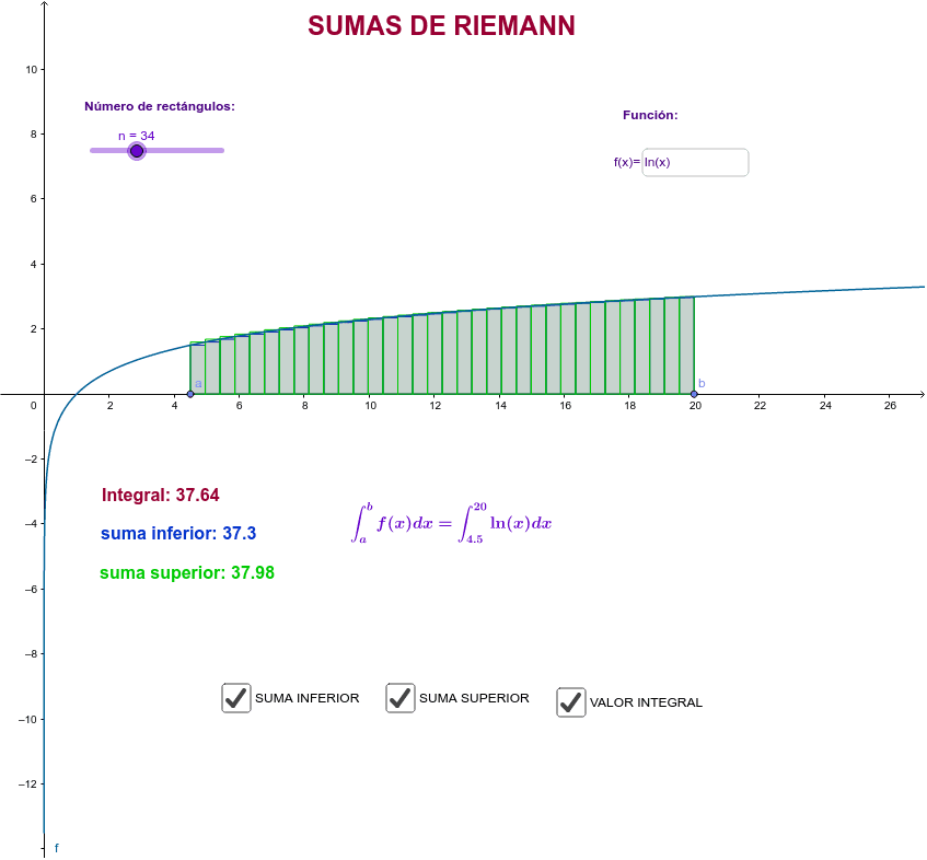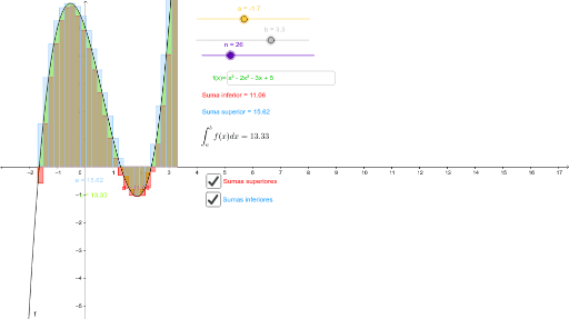 Adición Cálculo Integral Definida Cálculo integral Suma superior e inferior o suma de Riemann Instrucciones El siguiente applet te ayudará a calcular las sumas con rectángulos inferiores y superiores que se aproximan al área bajo la curva de una función. Area bajo curvas sumas de Riemann. 5En que consiste la suma de Riemann.