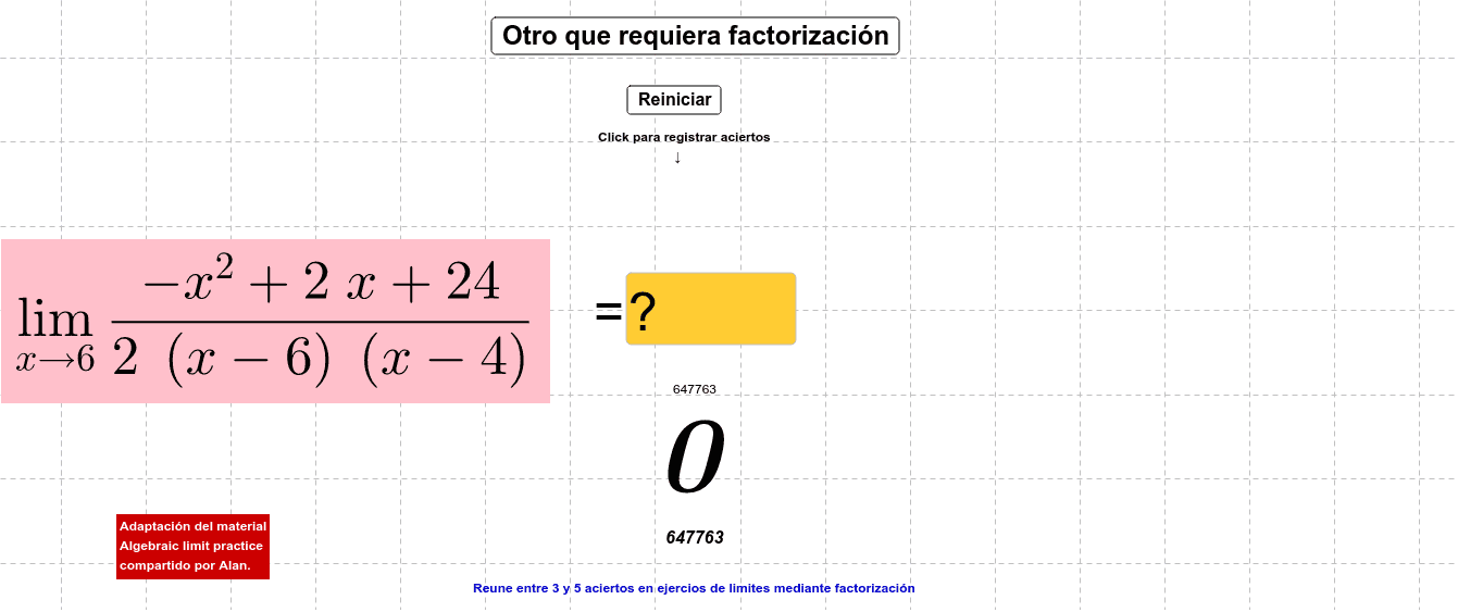Mejora tus habilidades en matemáticas con nuestra amplia lista de problemas difíciles. Mejora tus habilidades en matemáticas con nuestra amplia lista de problemas difíciles. Se tendra que factorizar para obtener un límite definido.